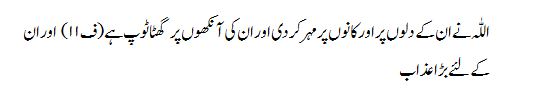 Allah has set a seal on their hearts and on their ears, and over their eyes there is a dark covering, and for themis great torment.